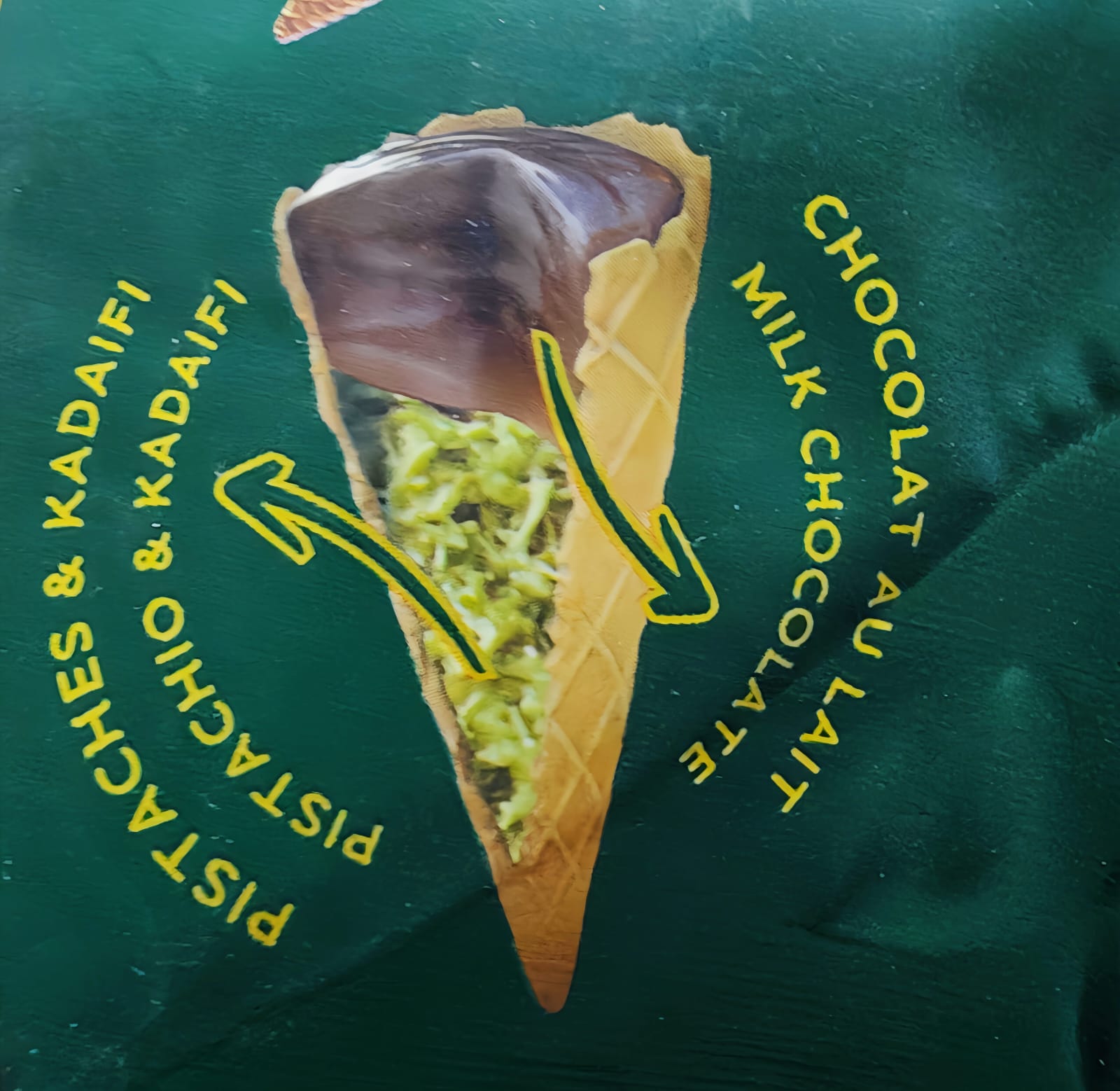 我們的杜拜甜筒將濃鬱的牛奶巧克力、絲滑的開心果奶油和金黃酥脆的卡達伊菲餅乾完美融合,包裹在酥脆的迷你華夫餅筒中。每一口都帶來口感和風味的極致享受:順滑、酥脆、香濃和堅果的交織,令人難以抗拒。