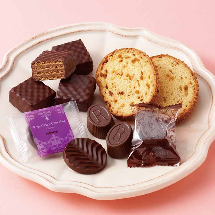 限量版 Royce's R 巧克力(摩卡咖啡口味)和 Royce's 烤麵包片(起司洋蔥口味)裝在一個帶有提把和絲帶的禮盒中。這套甜點組合與酒類飲品搭配相得益彰,是送給愛酒人士的完美禮物,也是饋贈親友的理想之選