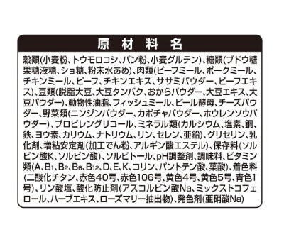 蛋白質:17.6%或以上,脂肪:7.5%或以上,粗纖維:4.0%或以下,粗灰分:7.5%或以下,水分:30.0%或以下